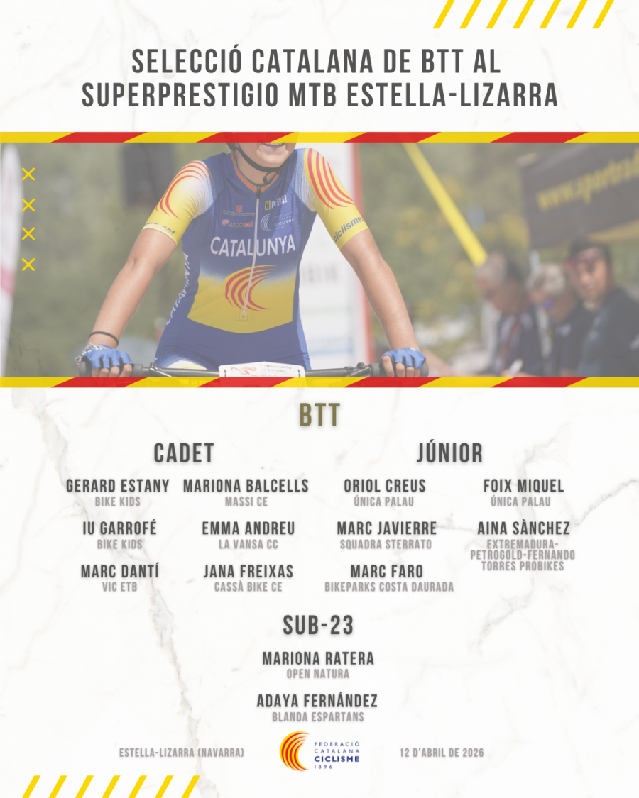 La selecció catalana de BTT està a punt per sortir a disputar el Superprestigio MTB Estella-Lizarra (Navarra) d'aquest 2026, que se celebrarà el pròxim diumenge 12 d'abril. El combinat català disputarà novament aquesta prova internacional UCI C1 d'alt nivell, organitzada pel Club BTT Navarra. La competició arrancarà a partir de les 9 del matí i es podrà seguir en directe a través de YouTube.